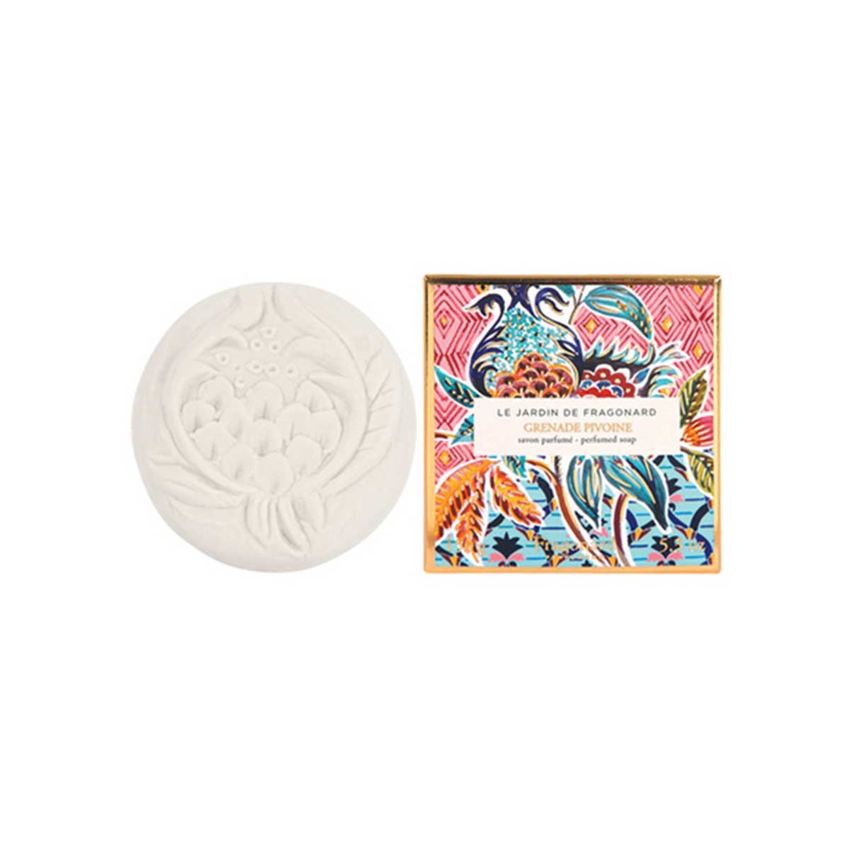 Grenade – Pivoine (Pomegranate – Peony) The iconic engraving on this soap releases the delicious pomegranate fragrance that it represents, blended with a heart of peony and rose absolute on woody base notes of cedar and oak.